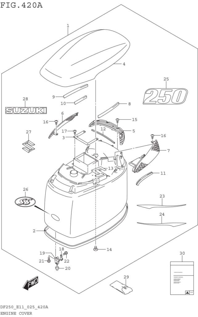 SPECIAL NOTE: FIG.420B(2-B-10) ENGINE COVER (DF250ST:025) FIG.420C(2-B-11) ENGINE COVER ((DF200T DF200Z):024) FIG.420D(2-B-13) ENGINE COVER ((DF200T DF200Z):025) FIG.420E(2-C-2 ) ENGINE COVER ((DF225T DF225Z):024) FIG.420F(2-C-4 ) ENGINE COVER ((DF225T DF225Z):025) FIG.420G(2-C-6 ) ENGINE COVER ((DF250T DF250Z):024) FIG.420H(2-C-8 ) ENGINE COVER ((DF250T DF250Z):025)